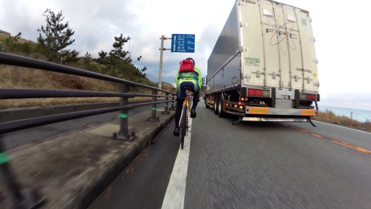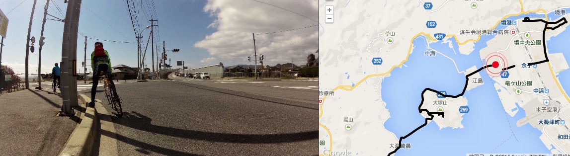 2015/03/09 Category : Road Bike One for all all for one 本来なら8日(日)は、子守りの日であった… 子守りの日であった… 子守りの日であった… … そして前日の7日(土)はフラット40を100までやり続ける予定であった… フラット100… フラット100… しかし7日(土)があいにくの雨で結局乗れずじまい… 今月の日曜は全て埋まっているし、これは嫁の実家の両親に頼んででも8日(日)は乗ってやろうと意気込む。 ちなみに8日(日)は嫁はバレーの試合… まずは無理を承知で自分の両親に頼むと あっさりとOK… ということで急遽フラット200に 目的地は大根島. 往復200どころか250はあります… 自分の最長記録は、温泉ライダー前にやった出雲大社(片道)までの183km この時、足は限界だった… それをはるかにオーバーする250… しかしなんとなくいけそうなきがしたので…ノリで… 今回のメンバーはヒシイさんとS君 ヒシイさんには目的地、おおよその走行距離をつけず… こういった場合、自分ならまず参加しないな 怪しさ全開スギル… 二人とも急遽前日に誘ったのにもかかわらず快く参加!さすがデス!見習わなくては… そして日曜朝…路面はウエット… 小雨決行予定なのでウエット程度は晴れと変わらない!意味不明 6:30に某ポプラで待ち合わせ. S君の姿はあるがヒシイさんの姿が… どうやら待ち合わせ時間がうまく伝わらなかったようだ. ということでワープしてもらい途中合流ということで一件落着… これは…策略か…真相は謎に包まれたままだ. S君には、 「今日は片道100Km練」 と伝えてあったので最初からガンガンいきます いつもあまり人の後ろにピタリとついたりしない自分も 今日はつかないとあとでデスだと思っていたので… これは意地でも!!! といいつつ離れ気味… なんか後ろにピタリって怖いんすね… 路面あまり見えないし、急な事があった時の対応がとれるかどうか… そんなこんなでほぼS君牽きでヒシイさんと合流地点へ 三人トレインになり、S君は相変わらず前で、次はヒシイさん、で自分 人がついている姿をマジマジ見るが… ヒシイさんうまい◎ 一定の距離を保ち、後ろで見ててすごく安定感がある… 自分が人の後ろついたら、ついたり離れたり…独り言言ったり… 変でいてなんか怪しい… パン屋の時クマさんにも言われたが、これほんと上手くなりたいす. 追い風もあり巡航速度は速め. 33km/hを下回る事はなかったような気がする. 去年は渡った境水道大橋 今回はやめときます. 自転車通行可かどうかははっきりしていません.お調べ下さい. というか当初の予定ではここらまで来る予定はなかった… しげる…しげる行くか… という会話がチラホラ… ということで水木しげるロード到着~ 子泣きじじいを発見したり 境港に来てるのにビーフカレーを食べる人がいたり 子供への土産をガチャガチャですまそうとする人がいたり なんだかんだ楽しみ、結果寄って正解という◎ ちなみに3月8日は水木しげる記念館の開館記念日らしく観光客もわりと多めでした. と普段を知らないくせに言っておきます…白目 満腹になり、ゆっくりと大根島を目指します. 鳥取方面から大根島への最短ルートで渡る橋といえば べた踏み坂で有名な江島大橋. 景色ばかり見ててサイコンは見なかったが勾配は鳥取県側は5.1% 島根県側は6.1%あるそうです. なぜこのような勾配があるかというと、まあ察しの通り船舶通航のためらしいです. JPEGでは乗っておるように加工してありますが この橋は自転車を降りて通行して下さい. そして既に大根島内にいるのに 「大根島はまだか!大根島はまだか!」 とぶつぶつ言う黒い人がいたり… で大根島へ到着.(既に島内) そもそもなぜ大根島を目的地にしたのかというと…なんとなくだったり… で、とりあえず小腹が空いたのでスイーツをという事でカフェ探し S君は相変わらず爽やかだが、二人は潮まみれ… 二人なら絶対入りませんねーとヒシイさんと意気投合するようなカフェへ このお店、調べると… 営業している時は青い旗があがっているらしい. 幸せの黄色いハンカチかーーーと 突っ込みつつ本当に青い旗があがっていたり 黒い人以外は、幸せの黄色いハンカチ=高倉健 黒い人は、黄色いハンカチ=ビートたけし と話が合わなかったり… 皆アイスコーヒーとケーキを頼み おしゃれな店なのにゲラゲラしたり… 寄ってよかった◎ と予定の時間を大幅にオーバー… にもかかわらず走ればまたまた小腹が空き安来のマックへ… 中高生の溜まり場へピタピタ○ッコりショッカー衣装で ハイヒールを履いているかのようにカツカツいわせて歩くのは正に … 拷問ダッタ… … あの眼差しにだいぶ精神を削られました… もう走る気をなくした黒い人をなだめつつ帰路へ 逆風と戦いながらも色々なリミットがせまり 暗闇での走行、体力、ライトの残量などを考慮した結果 ポート赤碕へ黒嫁に来てもらうことに… 嫁さんすみません… 久々にロードでのロングだったがとても面白かった. 遠い場所でも楽にいけるのはやはりロードの醍醐