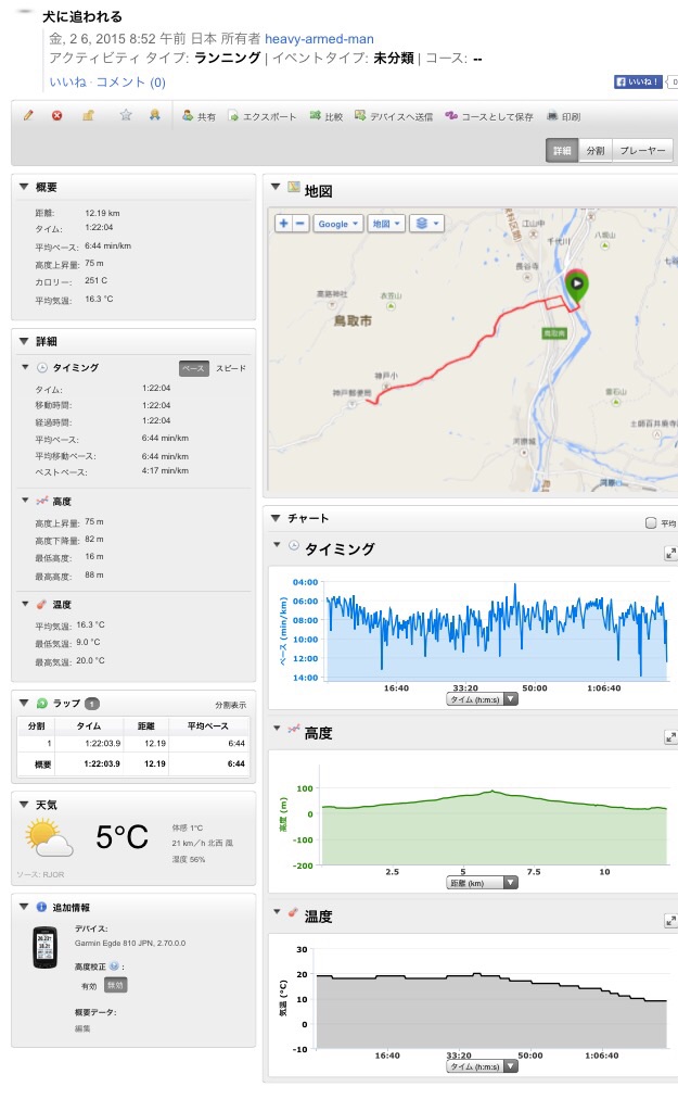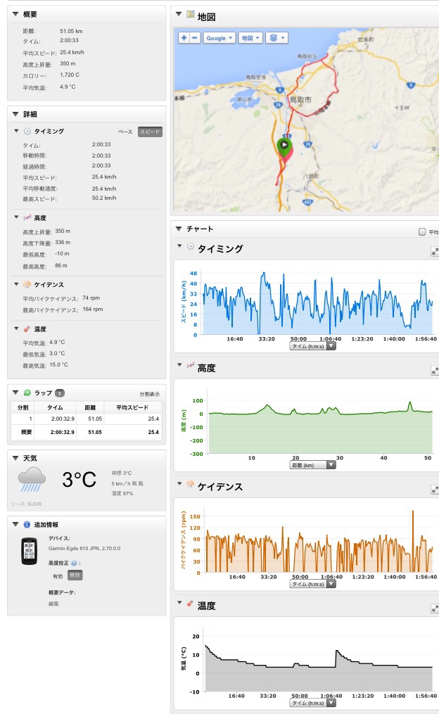 2015/02/07 Category : Road Bike らっすんごれらい 4日、水曜日。夜練。この日の仕事の区間は、十六本松から岩戸。砂浜を…砂浜を…砂浜を…8km歩き…白目サボろうとする僕を師は上手くかわしてサボらしてくれません(T_T)まあ走りだしたら疲れはとんで面白いデスけど。砂丘って、大王で飯って河原城で〆最初、河原城の前に中山ってから行こうとか言ってたけど止めて正解。リバース自爆するとこデスた…白目夜の河原城。夜練にいいかも?何時までかは知らないが早く来たらライトアップされてるし、ライト消えててもさほど怖くない(^ν^)5日、木曜日。ジョギング。コースは砂見方面。往復12km。ペースが遅すぎるが仕方ない。ミート君が重くて、揺れて、まだ走れまてん…白目というかこのログのタイトル…犬に追われる…えっ?えっ?なんて?……重装備者、6月で35才!真剣に犬に追われましたーーー!!!白目…ぜえぜえハアハア( ;´Д`)怪しい人間発見!噛んだれ!(犬)ワンワンワンワンワンワーーーーんε=ε=ε=ε=ε=ε=┌(; ̄◇ ̄)┘ワンワンワンワンワンワンワーーーーんε=ε=ε=ε=ε=ε=┌(; ̄◇ ̄)┘いかんリアルガチで噛まれそう…唸って威嚇…全くもって効果ゼロ(T_T)脅す為に蹴りを食らわす格好…ビビり気味で…弱々しく効果ゼロ(T_T)しかも近所の人見てた…すっげー恥ずかすーーーーーーーーざんす( ;´Д`)犬はまだ追ってきます…小石を拾い、投げつける!!!当たらなくても効果有り!!!でまた逃げる。犬ー追う。今度は両手にいっぱいの砂利を掴む。それにビビったか、テリトリー外に出たか犬はもう後ろにはいなかった。勝利!!!えっ?えっ?なんて?あ〜助かった〜〜〜〜ε-(´∀`; )怖かった〜〜〜〜( ;´Д`)もう毎日が刺激的…痩せたらリベンジに行こ!今度は走りでぶっちぎる…砂利を持ちながら…ちなみに首輪してます…白目6日、金曜日。サイクリング。コースは飲み会で話してた↓ツールド鳥取。改め山嵐。150kmの3000上げ…の〜三分の一を走ってみました。平日なのに休み=ε-(´∀`; )出ようと思ったら雨×二回…萎えます。萎えます。萎えます。若干降ってたが、もういいわーーい的なノリでスタート。まずは前日のジョギングで走った砂見方面の谷へ〜砕石場方面へ向かいます。ちなみに路面は落ち葉、落石、泥、とオススメ出来ません。勾配は結構キツイです。まあ自分の物差しなので…白目雪の季節でも走れるように標高はそんなに上げずを考慮したコースデスが積雪が…雪が見えたら普通は引き返すだろうけど、今日はウエットでドロドロなので。というか雪道をビビりながら楽しんだり…哀愁漂う後ろ姿えっ?えっ?なんて?…衣笹山の展望台に上がります。初デス。というかこの道通ったの二回目ぐらい。画像では全く伝わりませんがとてもいい展望台です。三角点もあります。自転車で隠れて見えませんが。この場所…楽しいぞ…ダメだ…我慢できん…ノセタ( ̄▽ ̄)ここほんといいデス。しかし展望台までは階段デス。今なら雪なのでクリート部が雪でてんこ盛りになり下駄みたいになるデス。…え〜それではいつもの…(・Д・)ノhttp://youtu.be/vEtNdV9AYbY結構レアな道を通ってて、面白いかも?ロードで悪路は控えますデス。悪路専用通勤マシーン出でよ!!! [0回]