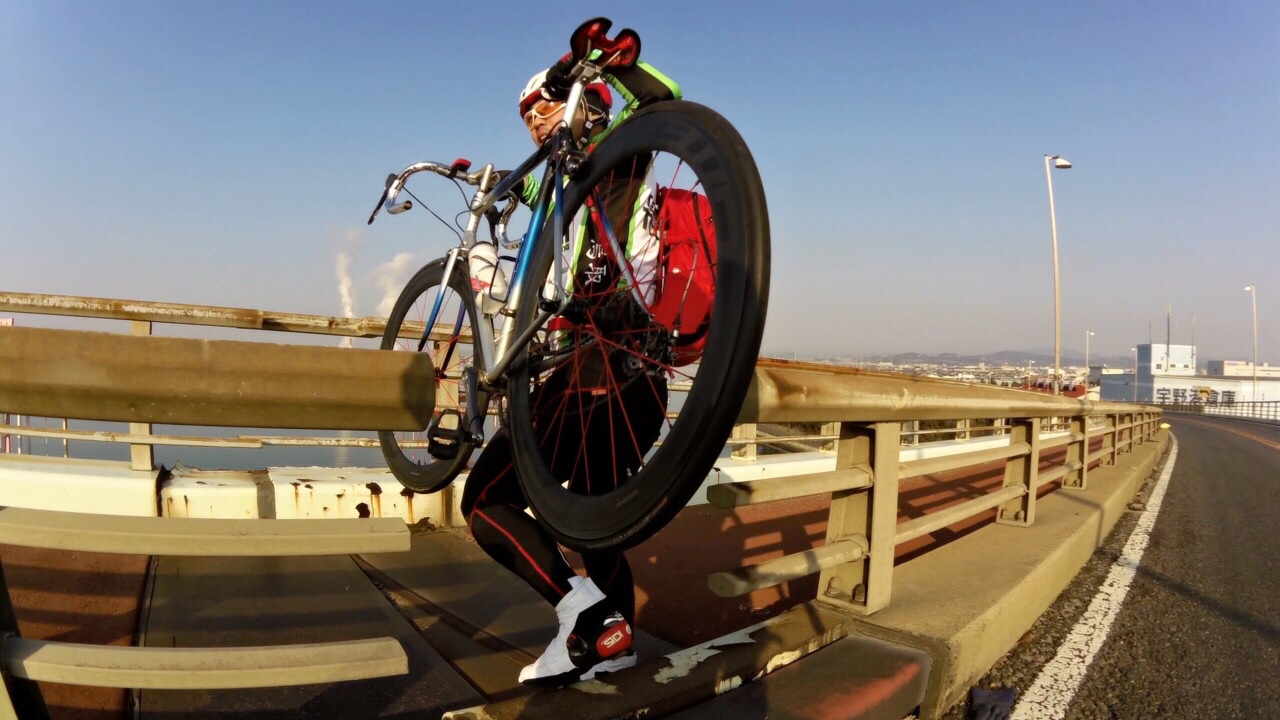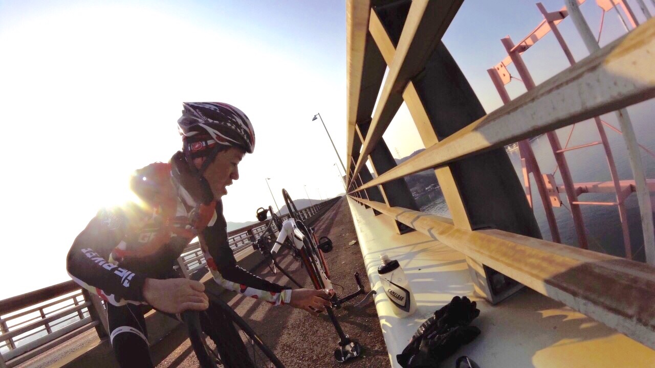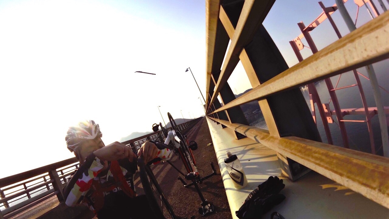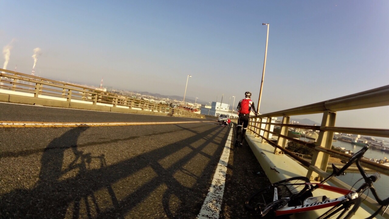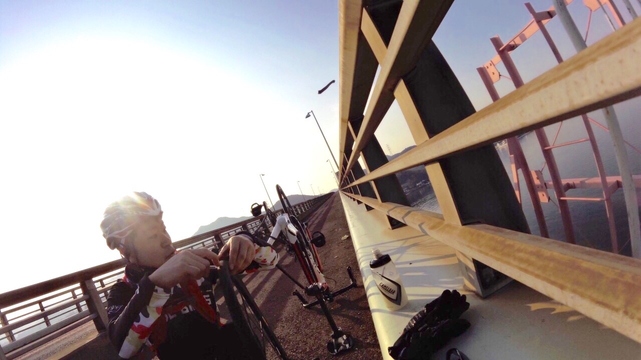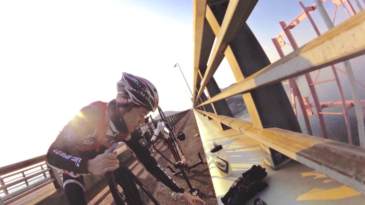 2015/01/07 Category : Road Bike プロジェクト J 1 プロジェクト Jこの計画を立て始めたのが…昨年の12月中旬ぐらい。うん!浅いε-(´∀`; )…まず岡山ポタを計画するドリさんのとこへ偽名であげてみる。ドリさんにはバレてない様子だが先生には全てお見通し…で、もちろん参加してもらえると◎しかし、そこでちょっと問題が起こった!瀬戸大橋って言っているのに、しまなみというキーワードが会話の中に…これはもう「右」ってやつを「左」って言わせるようなもんだ…しまなみは遠いのでまたきっちり計画してからでお願いします 白目そしてもう一人のお方は〜ハマグリ…小栗しゅん似のSくん!朝練でたまに会ったり、温泉ライダーですぐ近くに陣取っていた事もある。なぜS君を誘ったというと〜長くなるので想像にお任せしますwで、で瀬戸大橋案は見事にスルーされ…この時スルーされて本当良かった。え〜パソコン二台体制でコースを考えます。マックでストリートビュー見ながらWindowsでラボる。マックはマウスは無しで怪しい?指使いで操作しているんだけども、たまにWindows見ながらマックで指動かしたり、マック見ながらマウス動かしてみたりとバグりすぎ 白目え〜交通量、路面、外側線より外側の幅、チャンネーへの出会い率…を考慮しながら〜考えた前半のルートがこれ↓http://latlonglab.yahoo.co.jp/route/watch?id=5eeee3742fc6b27d55d0125637b8e35b正月休みこれでほぼ潰れた\(^o^)/最初は湾岸沿いを検討して作成していたのだが距離がかさむので却下しこの案へ。実走で危ない箇所も分かったので次回は湾岸沿いで\(^o^)/あ〜どうしよう話をどこらへんからまた戻そう……百均の座布団が干渉を防ぎます。そしてちょっとこの姿かわゆす(´∀`)サイドバッグを付け旅に行くみたいw5時20分に先生宅へのところを4時50分には着きそうに…楽しい事を考えると我慢出来なくなるやつデス。ああブルーハーツに面白い事を考えてー♪みんなを楽しくさせたいなー♪って歌があったな…脱線のし過ぎで話が進まないとデス 白目デスえー一気に〜喪黒福造ばりに〜ドーーーーーーーーーーーーーーーンって言うわりにはあまりとんでおらずの〜山陽ふれあい公園へ。ここに車を止めスタート!!!Sくんの愛車がSわ〜クスへ…いいな〜いいな〜って感じでワイワイするのじゃなく…何買ってんだ{(-_-)}と若干イビリ気味 白目事前に先生からゴニョゴニョされてたので、ターマックご購入は既知でアルこの日までに、ター ネタ画像をSくんにラインでガンガンぶっこむ!!!うまくかわしているのかリアル気づいてないのか、全く分からない(; ̄O ̄)やはり話が脱線する…そしてコースも脱線する。児島湾大橋手前で橋を渡らず下の道へ…Uターンし橋を渡ります。自分先頭の重装トレイン発車デスアーチ具合がすごい橋デスとなると逃げの部分の継ぎ目も…この後、重装トレインも大脱線で壊滅的ダメージ!!!そのダメージを与えたのがこれだ!!!123この継ぎ目にやられました!!!リアルなやつは後に動画で…先頭→自分→はまらずに上手く通過二番→S君→激しい音とともにパンクケツ→先生→…ほんとすみません…もう今日はもうやめようとオモタ…しかし先生は気にするなって感じのドシーンっぷりやはり先生は偉大です。道場の主です。そして今日の先生は沢庵和尚の実写版!!!ダンディなヒゲが悟り感を出しすぎデス各々が、マシーンチェックやパンク修理をしてリスタート!が、S君またパンクε-(´∀`; )自分は外したチューブをパッチで修理するがうまく出来ず…「S君〜パンク修理失敗したからとりあえずゴムのりでマーキングしといたよ〜」…あなたは犬デスか…そんなこんなでワイワイ、ペチャクチャ、イチャイチャ?しながら作業していたところを一人の自転車マンが通過〜なんと、先生のお知り合いのジャイアンさんでしたーーー!!!始まったばかりなのに宝庫過ぎるwまたまたワイワイ、ペチャクチャ、イチャイチャしてると…S君がいきなり叫ぶ…ワーーーーーー!!!!!!どうした!!!!!動画→静止画切り取りがこれだ!!!123飛んで〜♪飛んで〜♪飛んで〜♪飛んで〜♪回って〜♪回って〜♪回って〜♪落ち〜る〜♪タイヤレバーが飛んで橋の水落としの穴へダイブっす( ̄▽ ̄)穴付近でいじるのはやめましょうwで安全のために今一度再確認。危なそうなとこは一旦止まってでも歩道へ。危なそうなとこは車間距離をあける。ってことを話合いリスタート!橋渡ったローソンにて地元の人かと思い、走りやすい道を聞こうと思ったら…600kmのブルペ?の最中らしいブルペ…?先生にその時聞いたけど忘れたε-(´∀`; )そして朝方、凍結で他の選手がこけまくったと…(; ̄O ̄)なんか壮絶〜( ;´Д`)2へ続くか…動画丸投げか…白目 [0回]
