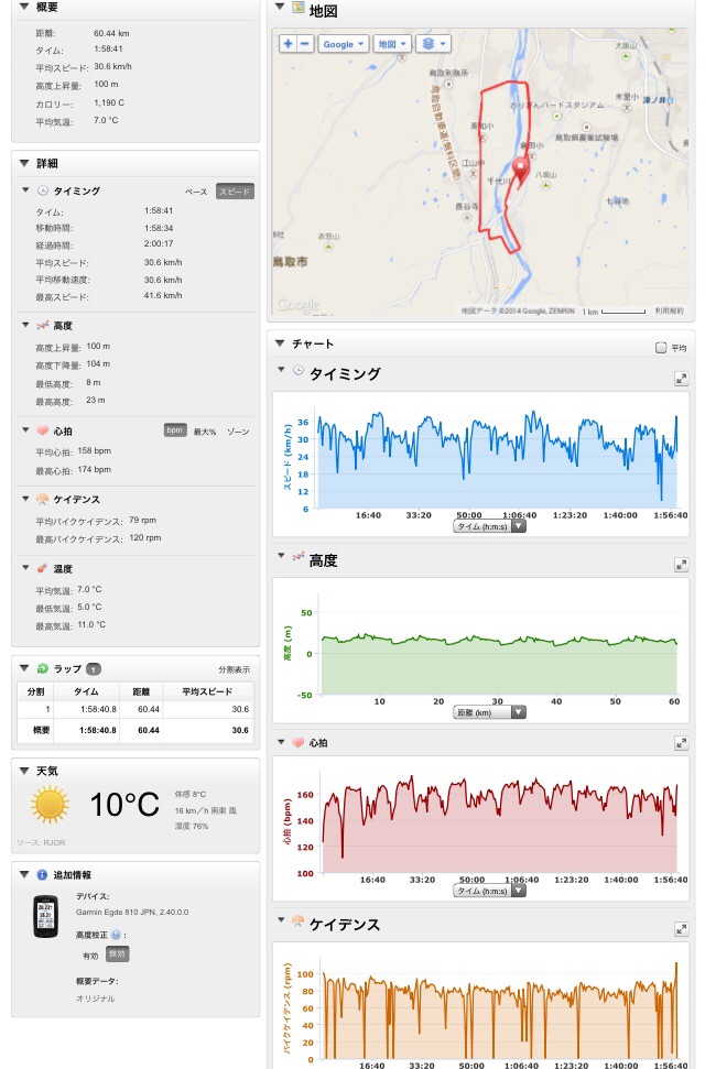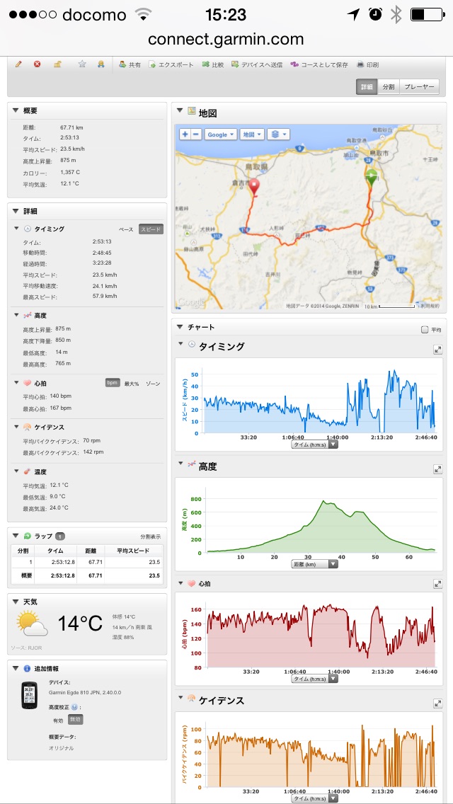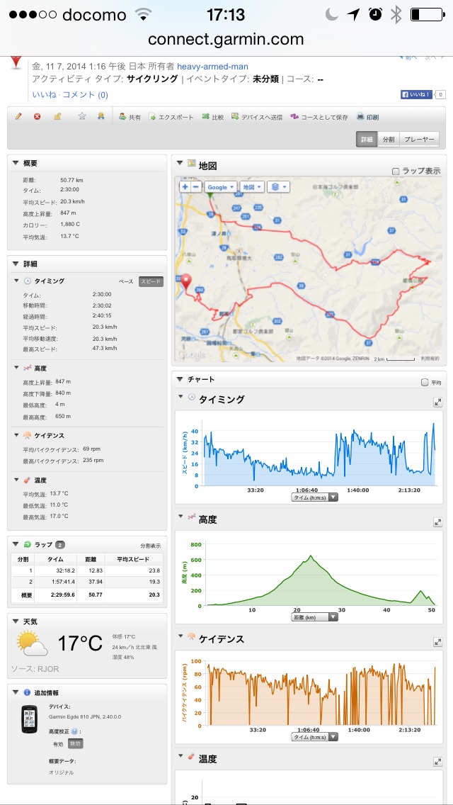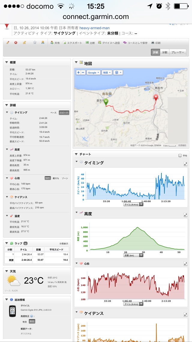 2014/10/26 Category : Road Bike 役場前ライダー 前日に、三朝へ行こうかと悩む。ルートは往路は辰巳峠で復路は小鹿渓で高山クライムコース。メインは三朝温泉ライダーのコースの下見。先生や師の方々へ頑張ってもらおうと(汗)あと大漁旗振るのにいいポジション探し( ̄▽ ̄)問題は…復路の獣…あと高山のトンネル…こないだライトが逝って前使ってたやつを使っているけど、不安過ぎる光量(大汗)いやすみません…光量どうこうよりトンネルが怖いんデスーーーー白目先生は忙しそうだし、1人で行く事に( ;´Д`)いつものショーツにoversocksアイマス◎…途中は略で…佐治川ダムこの岩が見えてきたらホッとしますε-(´∀`; )恩原湖沿いって大好きです( ̄▽ ̄)三朝手前で休憩しつつーー温泉ライダーコースへ到着。ルートラボからkmlデータをガーミンキャンプでデバイスへぶち込んであり準備は完璧( ̄▽ ̄)スタートは若干違う感じだがこれであっているでしょう\(^o^)/このコースをセグメントしてーー温泉ライダーセグメントの出来上がり〜当日、その場でアップロードしたらリアルタイムのデータができ面白いんじゃないかと!大漁旗ずっと振るのはしんどいし、こういう楽しみ方をしようかと♪で、肝心のコースですが…温泉ライダーというより…役場前ライダーじゃないかと(;´Д`A温泉地から微妙に離れているし、住宅地だし…県道の路面は工事でガタガタだし…まあそれは当日までには済みそうですが。とりあえず走ってみて、いまいちしっくりきませんでした(大汗)まあ当日は交通規制もあり、ガラリと変わると思いますが。役場駐車場から抜けるだろう細い道はクラッシュ注意デス昼から予定もあるので三周ほどで引き上げますあー絶対こっちのほうが楽しかろうに応援しながら温泉に浸かりたかった(; ̄ェ ̄)で温泉街も程々にーー小鹿ります。あーー今日は中津の集落が若干賑やかだったなーー軽トラの荷台で鹿の肉さばいてたし 白目小鹿ー高山は当分いいデス腰がやられました下りになってからは最高ですが◎最後に…重装式デジカメマウントで…下記URLをコピペで動画が見れます。http://youtu.be/MCdzgJdYjfYもしくは 三朝温泉ライダー 試走 で検索して下さい。動画の貼り方が分かりません\(^o^)/セロテープ固定式なので…白目 [0回]