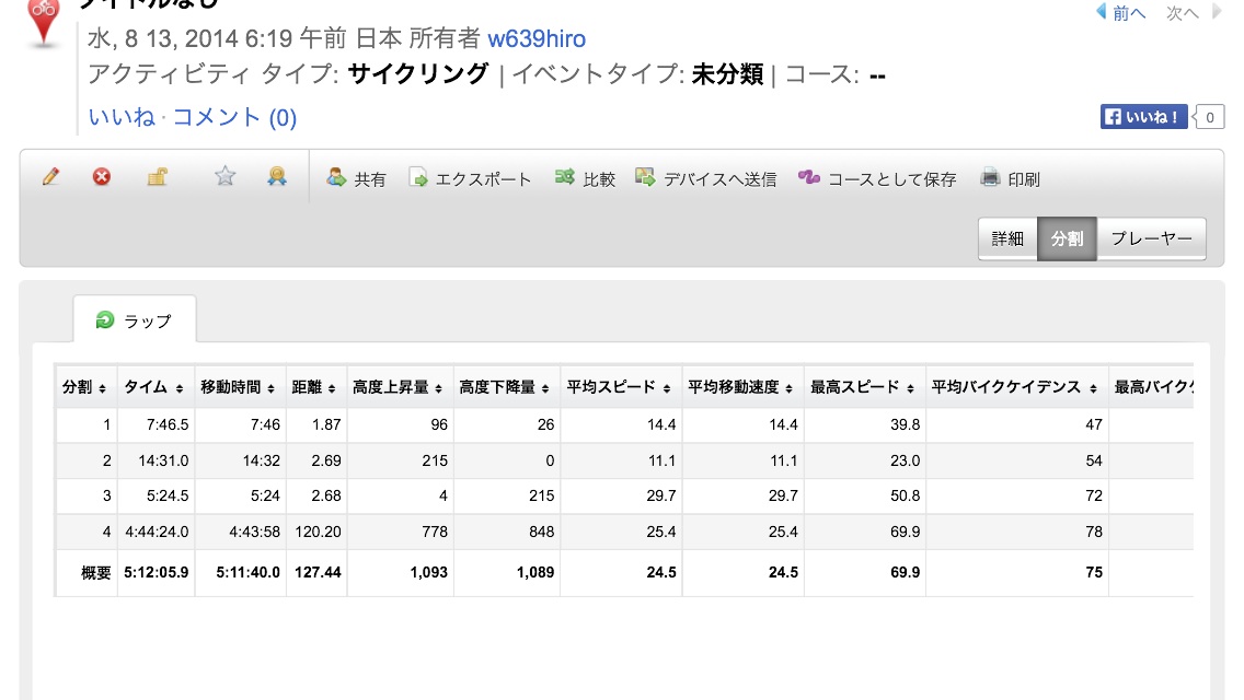 2014/08/14 Category : Road Bike マルコです門 久々の門練!いつも当日にLINEで誘われるパターンだったけど、初めて前日から予定決める。しかし先生のノリはフワフワ気味( ;´Д`)他人と走る機会がない自分はこの門練を楽しみにしとるんですけど…( ̄◇ ̄;)7:30待ち合わせの予定で6:00には家を出る目指すはやはり空山ーー!ラップボタンを押してスタート!前日が15分30で今回は…14:32!!!やりました(^ν^)最後の激坂をいつもより回せた気がします◎目標は11:30なんでまだまだなんですけどね…勢い的にもう一回いきたかったけど今日は山の予定なんで無理はせず400上げぐらいで万葉を目指す7:15万葉着!ブログ確認…8:00になりそうデス!先生ーーー!( ̄◇ ̄;)と、ローディーが一人到着したっぽい車通勤の時、何回かすれ違ったマルコ先生!!!初めまして!!!そして続々とローディーが集まり黒スパさん、F肉さん、ふくさん門先生も到着し出発ーーー!このパターンは必ずピースを…あ、マルコ先生まで…F肉さんと別れ三人で佐治を目指します。待って下さい( ;´Д`)速いっす…用ヶ瀬のポプラでやっと休憩〜「そのボディで赤コーラはやめなさい」…ここでマルコ先生とはお別れJ君として僕を鍛えて下さい!またお願いします!でいつも?のルート見直し会議を終え三朝却下(^ν^)恋山形駅行って板井原のカフェを目指すことに先生は今日はパナモリこのドツボ感にジェラシーハンカチを噛み締めるハンカチローディー……到着〜エリオタンこのポーズは?やはりこっちが良い◎板井原のカフェの営業を確認しようとネットを開くが閉店しました…( ;´Д`)コンビニでアイスを先生どう?イラネ(・ω・)ノ用ヶ瀬の喫茶店を目指すこっちにはねえよ!MAPみたけどなかなか辺鄙なとこに位置づけ…村の中をウロウロしまくり思いっきり分かりやすい場所だったり…喫茶店のにおいが良い◎あ、先生のしか撮ってないわ…満腹後の53号微下りは…気持ち良過ぎて寝かけたzzz神戸の谷から松上の谷へ抜けクールダウン気持ち良さそう!!!自分、実は…足が攣りそうで靴を脱ぐ動作をしたくなかったんです(。-_-。)結局、無茶苦茶アタックで攣ったんすけど(。-_-。)先生またお願いしますねー!次回までにまた特訓しときます(^ν^)そして帰ってガーミンを充電しようとすると…差し込み口が汗で錆びて充電できません(T ^ T)修理に出すとしても出している間どうしよう(; ̄O ̄)明日、100均でストップウオッチ買うか…今月、1000キロ目指そうと思ったのに手動アップか…めんど( ;´Д`)やめた!空山TTと中山TTを繰り返そう首からストップウオッチ下げてね… [1回]