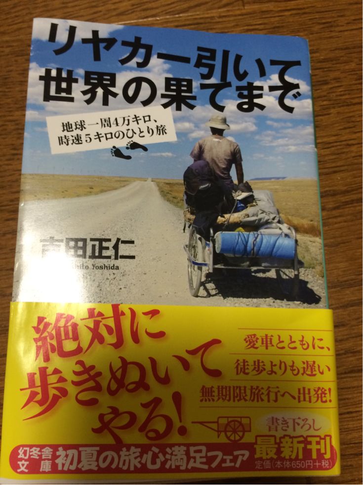 2014/07/10 Category : diary リヤカー引いて世界の果てまで 同級生、吉田クンの本が出版されました。時速5キロでリヤカーを引っ張り四年半かけて歩いた距離は4万キロ!旅の道中での大変さはもちろん人の温かみや街のニオイまでリアルに伝わる一冊です!そういえば、日本に帰国した時に帰るルートをチャリで下見しに行ったのを思い出しました。真夏で汗が目に入りまくり炎症して手術した記憶が…( ;´Д`)文章だけでも旅の背景が伝わるのだが、画像を見ながらだとより楽しめます。地球一周って自分の中では規模が大きすぎるが、日本一周はしたいなーと思ったり…定年後か… [0回]